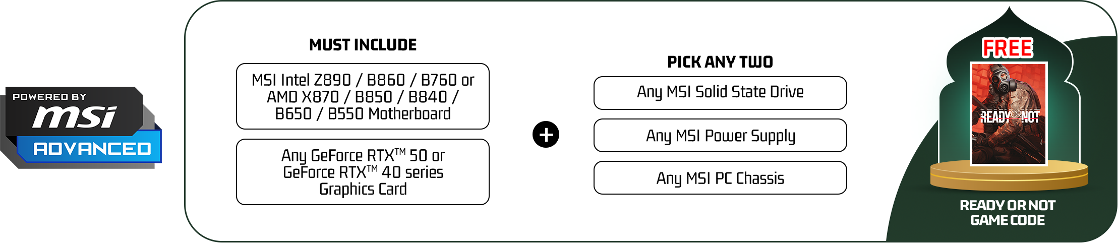 - Eligible to redeem (1) game “READY OR NOT” when select Powered By MSI PC purchased( 1*MSI Motherboard + 1*MSI Graphics card + Any 1* MSI component)