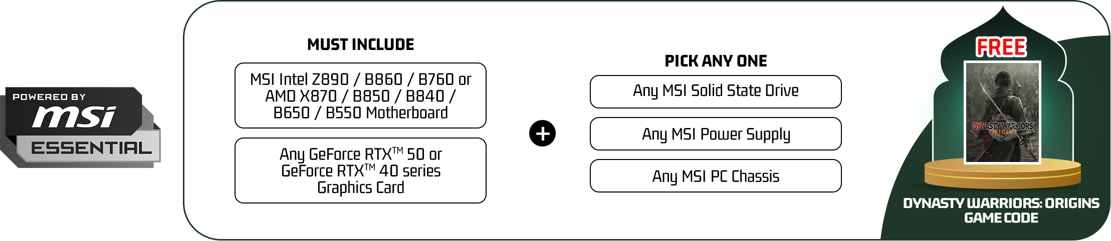 - Eligible to redeem (1) game “DYNASTY WARRIORS ORIGINS when select Powered By MSI PC purchased( 1*MSI Motherboard + 1*MSI Graphics card + Any 2* MSI component)